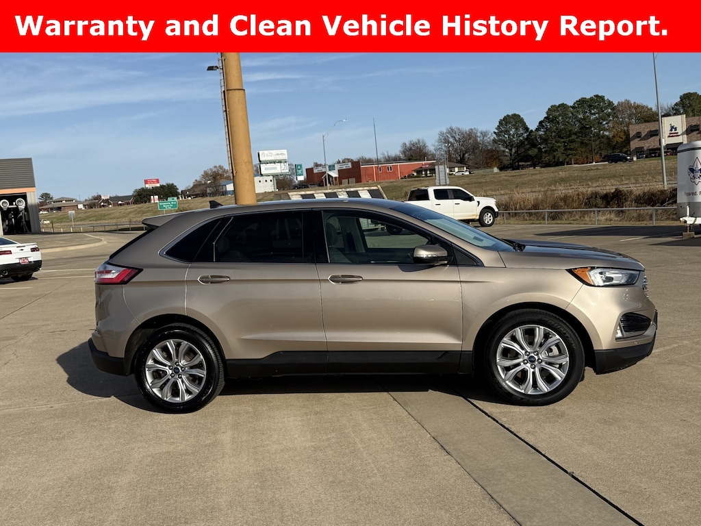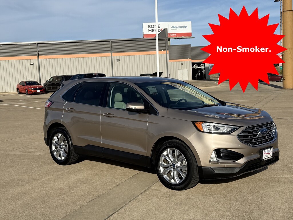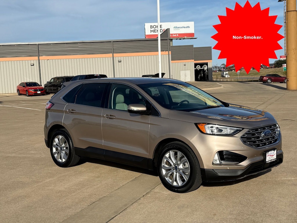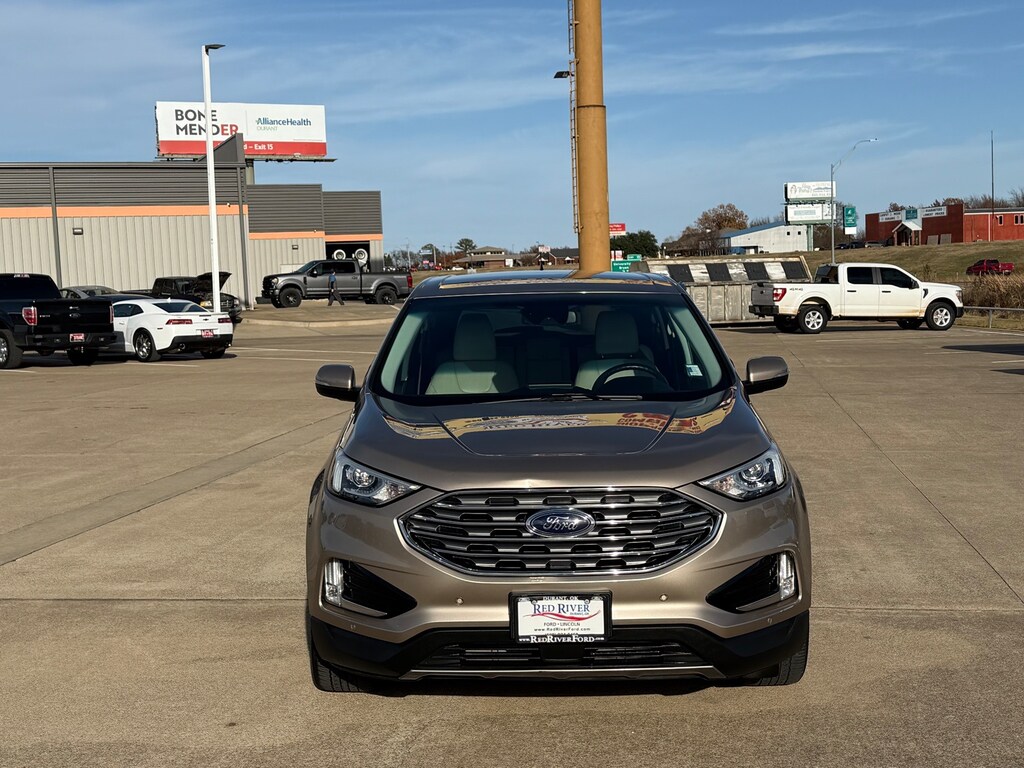 This is a 2021 Edge Titanium in Tan. It has Power Heated Leather seating, Heated Steering Wheel, Navigation, Satellite Radio, Rear Camera, Blind Spot Monitoring, Back-Up Sensors, Ford Co-Pilot 360 Assist, Evasive Steering, Adaptive Cruise, Lane Center, 19" Wheels and more. This is very well equipped vehicle! See for yourself at Red River Ford in Durant!
