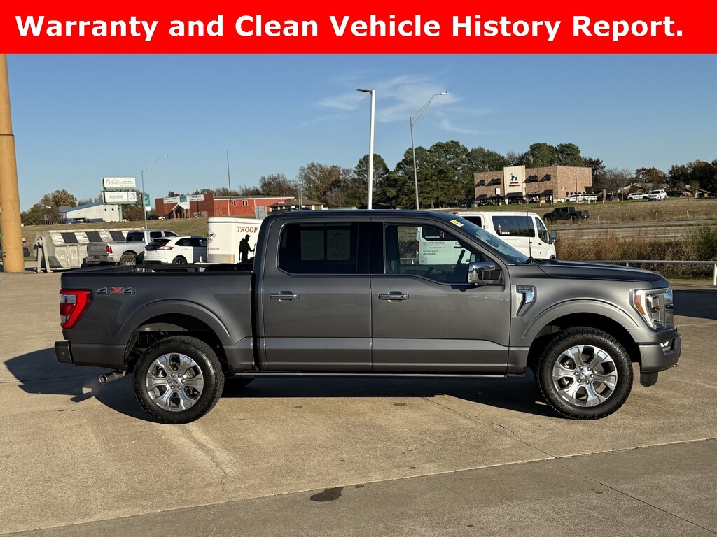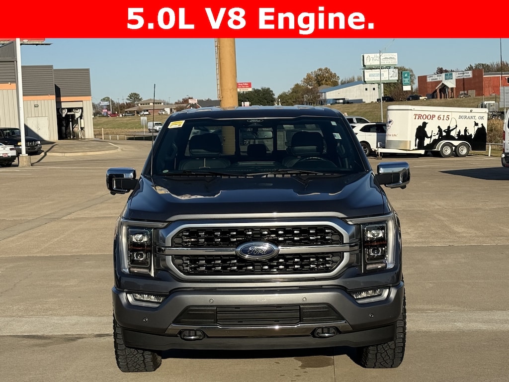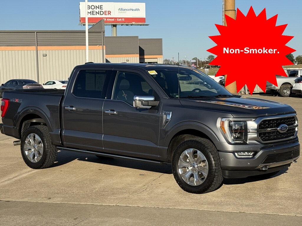This is a 2022 F-150 Platinum 4x4 SuperCrew in Gray! It has Cooled/Heated Power Leather seating, Heated Steering Wheel, Navigation, Satellite Radio, Ford Pass Connect 4G Modem, 360-Degree Camera, B&O Sound System, Ford Co-Pilot 360, Lane Keep, Post Collision Braking, Back-Up Sensors, Bed Utility Package, Tailgate Step, Blue Cruise, 20" Wheels and much more. Come see and drive this one today at Red River Ford in Durant!